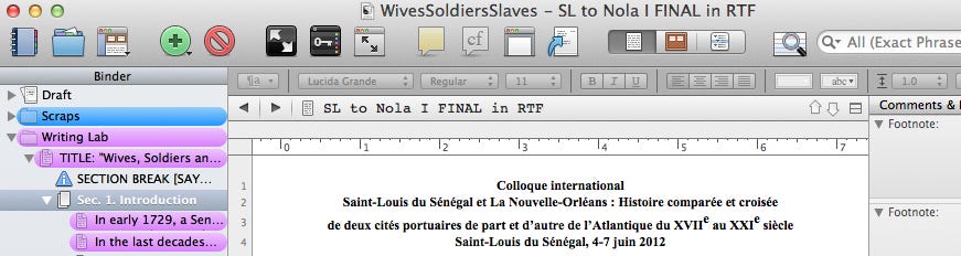 I create a Scrivener 'binder' for each book or essay project. Most of the writing happens in a folder I name the Writing Lab.